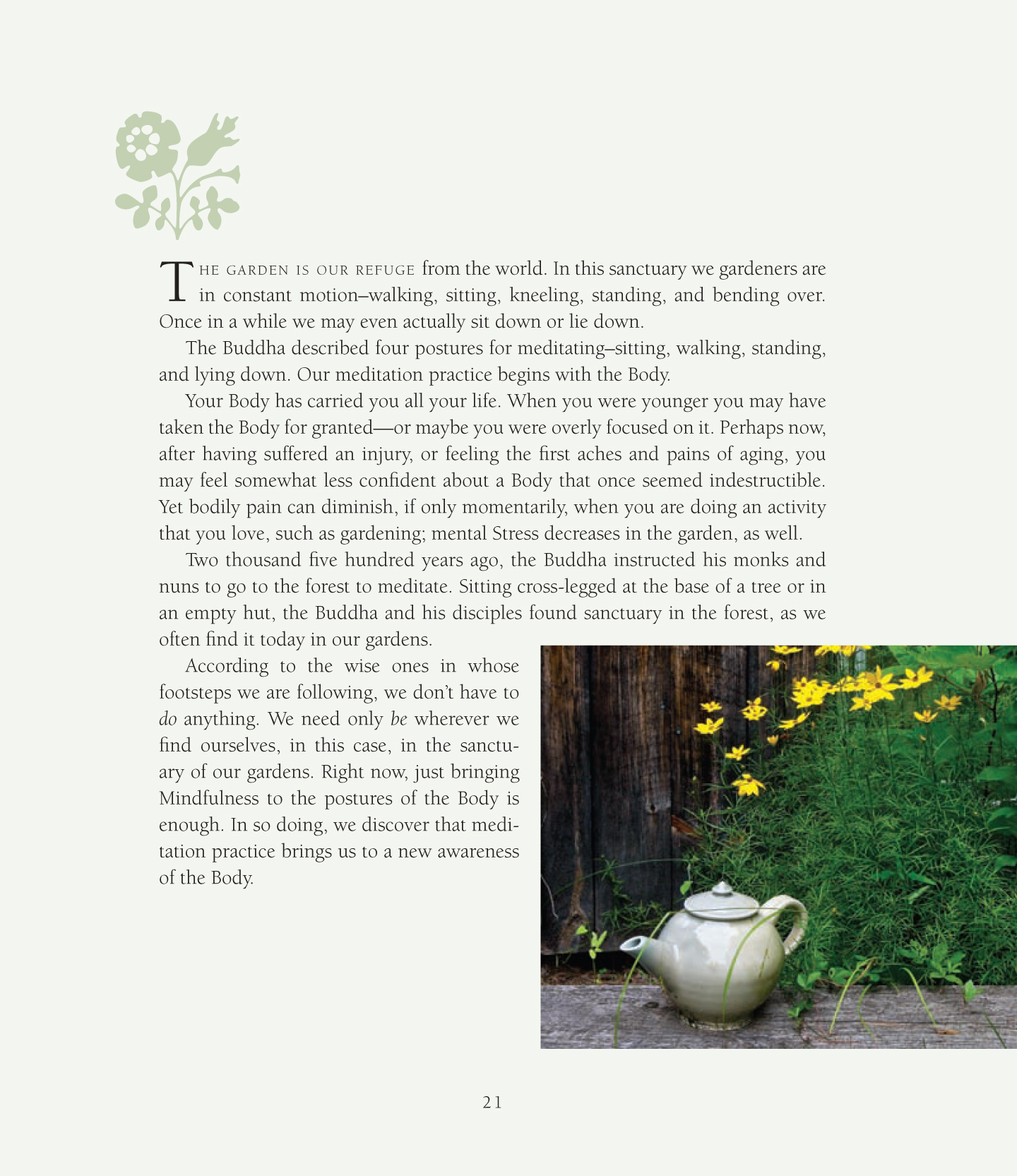 When the author and publisher, Cheryl Wilfong, came to visit me in my office one fine spring morning, her book was originally called “Buddhist in the Garden” which aptly describes her life and her integrity. I worked with Cheryl to create a book that reflected her work and teaching—her own path as a Buddhist as well—that others would enjoy. I wanted to make a timeless book; a book that people could hold and gaze at, but a book that would be durable enough to take outside for meditations. Carolyn Kasper, a designer with me at my small firm in Vermont, worked with me on the design, and we brought in a few local photographers to create a book that has what I think is a sense of place in the world of the garden. The author’s garden is oft photographed, and our photographers included some photos from their own travels to England, and Monet’s garden at Givenchy, for example.