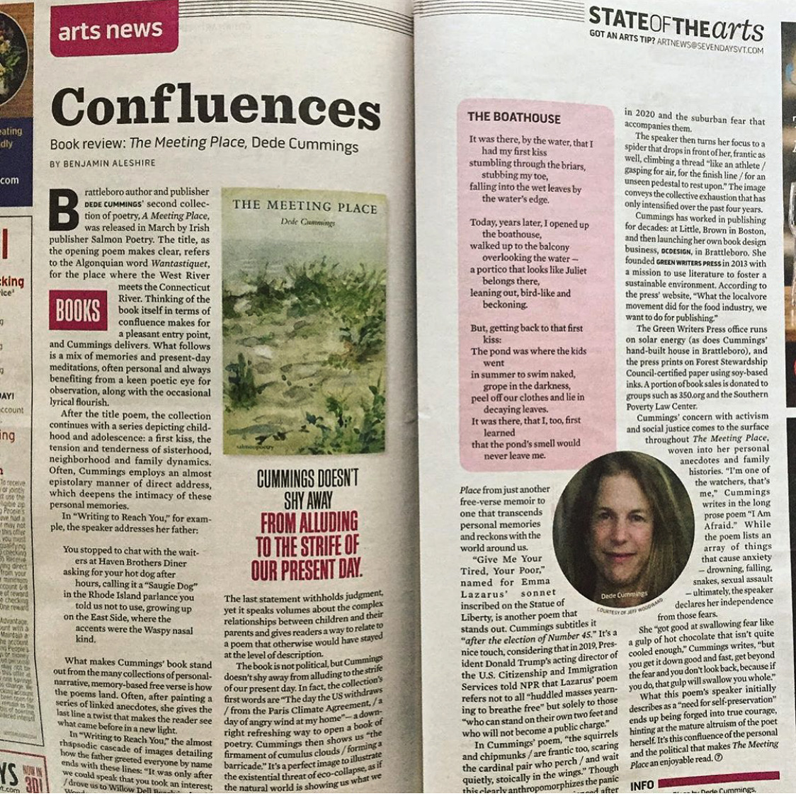 “Dede Cummings is a writer and commentator for Vermont Public Radio. At Middlebury College, she was the recipient of the Mary Dunning Thwing Award, attended the Bread Loaf Writers’ Conference, and studied with Hayden Carruth at Bennington. Her poetry has been published in Mademoiselle, The Lake, InQuire, Vending Machine Press, Kentucky Review, Figroot Press, MomEgg Review, Connotation Press, and Bloodroot Literary Magazine. She was a Discover/The Nation poetry semi-finalist and was awarded a partial fellowship from the Vermont Studio Center. Dede won the 4th annual Homebound Publications Poetry Prize for her collection To Look Out From (April 2017).”